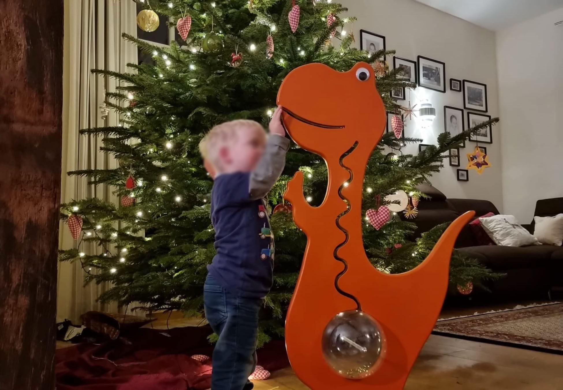 Mit jedem neuen Versuch wurde der Dino besser. Version zwei funktionierte spürbar sauberer, Version drei war stabiler – und heute, mit der vierten Generation, läuft alles perfekt: Die Münzen rollen weich hindurch, die Verarbeitung ist hochwertig und der Lack natürlich kinderfreundlich.